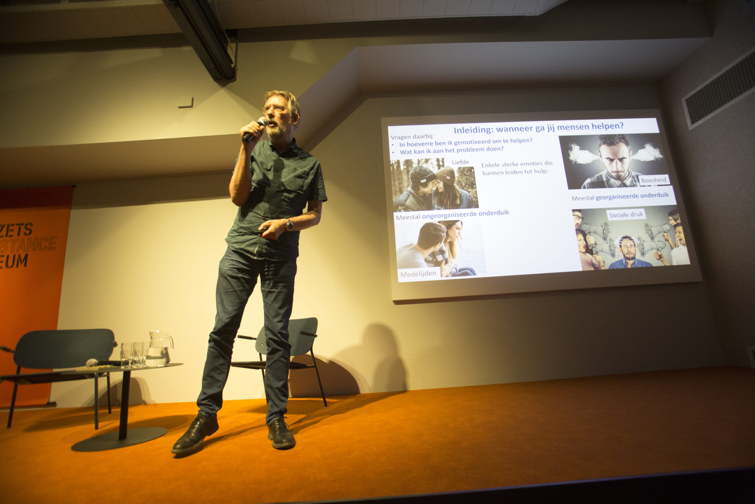 Bert Jan Flim nam ons mee in een interactieve presentatie over de verzetsgroepen die de kinderen naar onderduikadressen in Friesland en Limburg brachten. Waarom deden deze groepen dat en hoe waren ze georganiseerd? Hij zoomde in op het gezin Winnik waarvan de dochters Rachel en Lea onderdoken via de crèche.